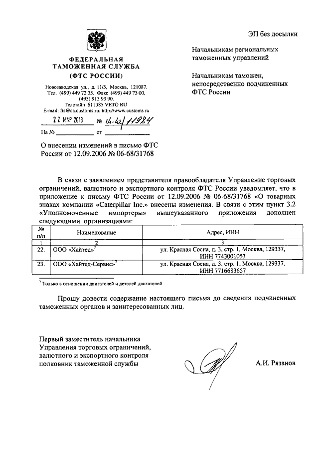 ПИСЬМО ФТС РФ от 22.03.2013 N 14-42/11984