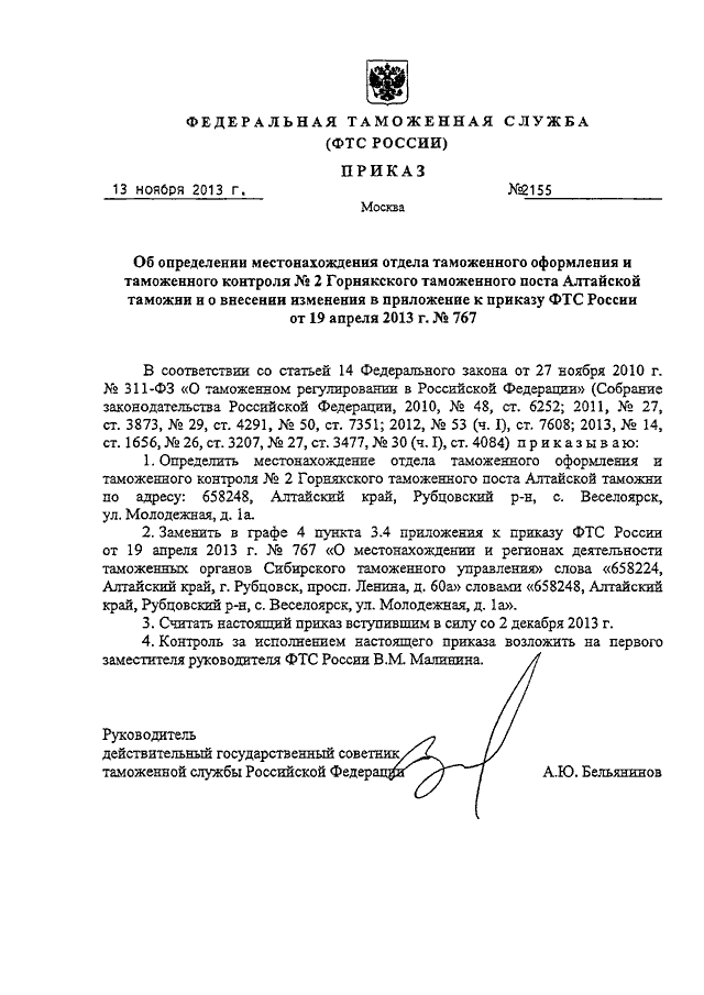 ПРИКАЗ ФТС РФ от 13.11.2013 N 2155 "ОБ ОПРЕДЕЛЕНИИ МЕСТОНАХОЖДЕНИЯ ОТДЕЛА ТАМОЖЕННОГО ОФОРМЛЕНИЯ И