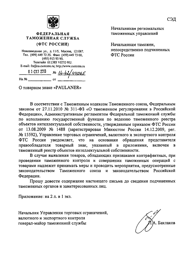 ПИСЬМО ФТС РФ от 03.10.2013 N 14-42/44065