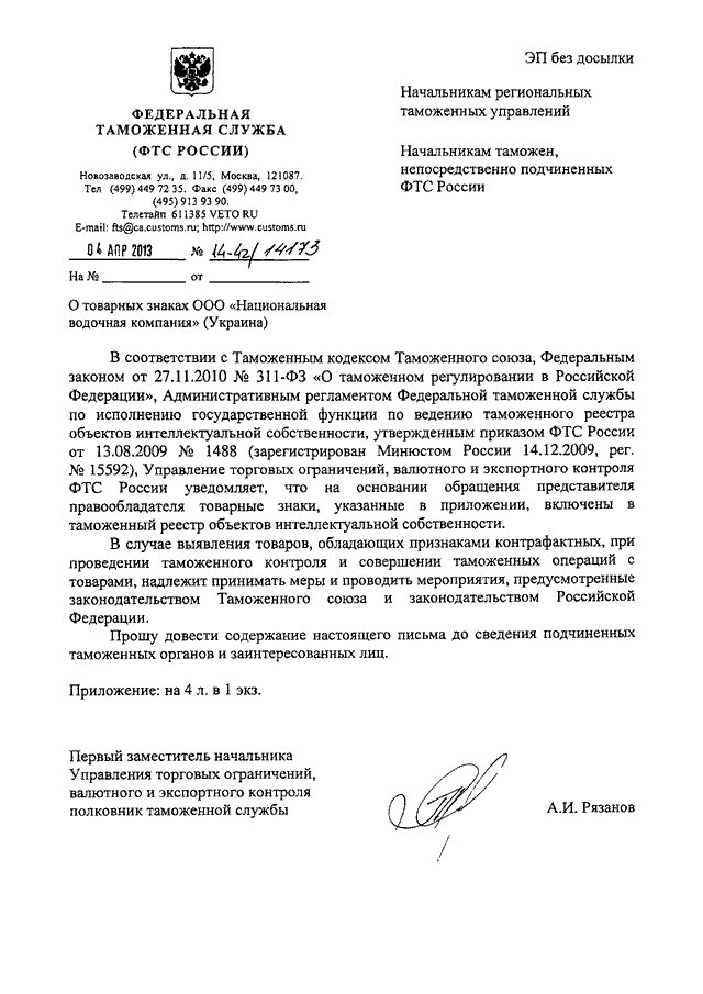 ПИСЬМО ФТС РФ от 04.04.2013 N 14-42/14173