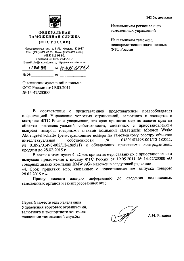 ПИСЬМО ФТС РФ от 27.03.2013 N 14-42/12752