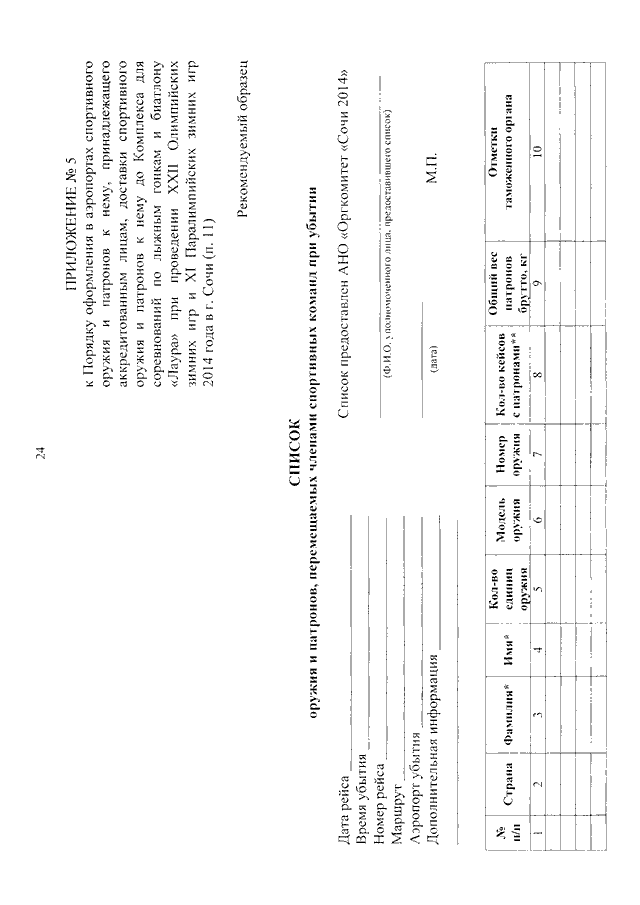 "ОБ УТВЕРЖДЕНИИ ПОРЯДКА ОФОРМЛЕНИЯ В АЭРОПОРТАХ СПОРТИВНОГО ОРУЖИЯ И ПАТРОНОВ К НЕМУ, ПРИНАДЛЕЖАЩИХ АККРЕДИТОВАННЫМ ЛИЦАМ, ДОСТАВКИ СПОРТИВНОГО ОРУЖИЯ И ПАТРОНОВ К НЕМУ ДО КОМПЛЕКСА ДЛЯ СОРЕВНОВАНИЙ ПО ЛЫЖНЫМ ГОНКАМ И БИАТЛОНУ "ЛАУРА" ПРИ ПРОВЕДЕНИИ XXII ОЛИМПИЙСКИХ ЗИМНИХ ИГР И XI ПАРАЛИМПИЙСКИХ ЗИМНИХ ИГР 2014 ГОДА В Г. СОЧИ"