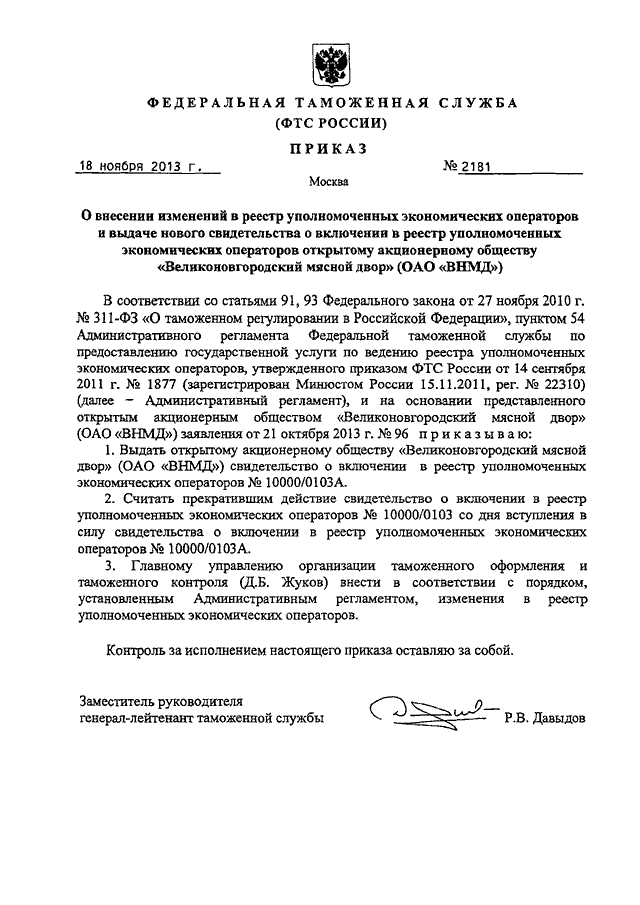 ПРИКАЗ ФТС РФ от 18.11.2013 N 2181 "О ВНЕСЕНИИ ИЗМЕНЕНИЙ В РЕЕСТР УПОЛНОМОЧЕННЫХ ЭКОНОМИЧЕСКИХ