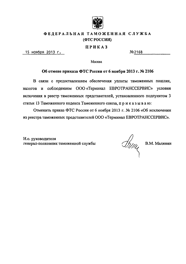 "ОБ ОТМЕНЕ ПРИКАЗА ФТС РОССИИ ОТ 6 НОЯБРЯ 2013 Г. N 2106"