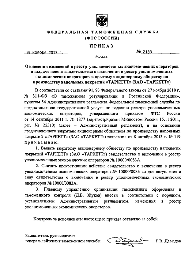 ПРИКАЗ ФТС РФ от 18.11.2013 N 2183 "О ВНЕСЕНИИ ИЗМЕНЕНИЙ В РЕЕСТР УПОЛНОМОЧЕННЫХ ЭКОНОМИЧЕСКИХ
