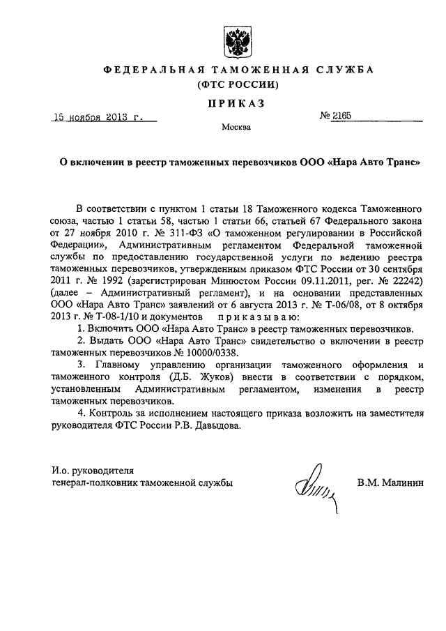 "О ВКЛЮЧЕНИИ В РЕЕСТР ТАМОЖЕННЫХ ПЕРЕВОЗЧИКОВ ООО "НАРА АВТО ТРАНС"