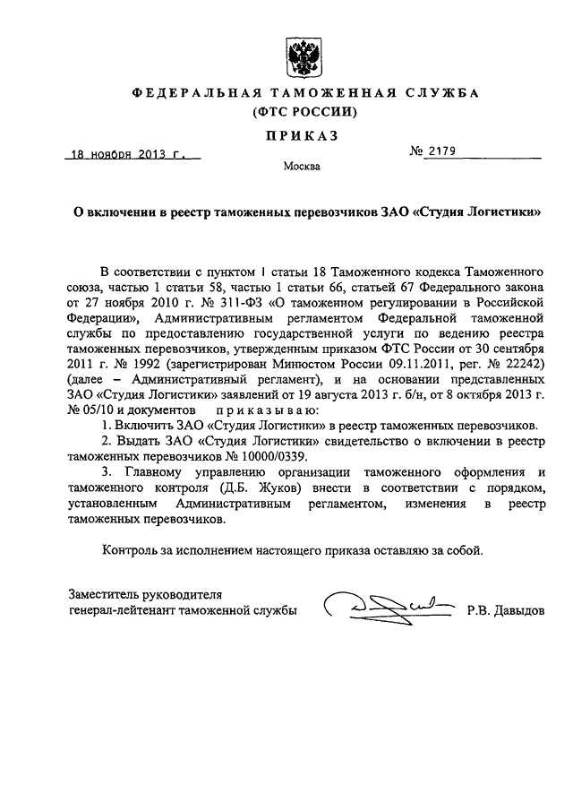 ПРИКАЗ ФТС РФ от 18.11.2013 N 2179