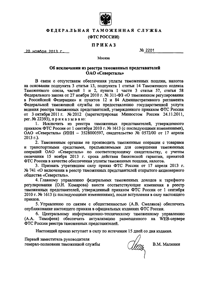 "ОБ ИСКЛЮЧЕНИИ ИЗ РЕЕСТРА ТАМОЖЕННЫХ ПРЕДСТАВИТЕЛЕЙ ОАО "СЕВЕРСТАЛЬ"