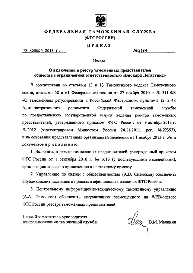 ПРИКАЗ ФТС РФ от 19.11.2013 N 2194