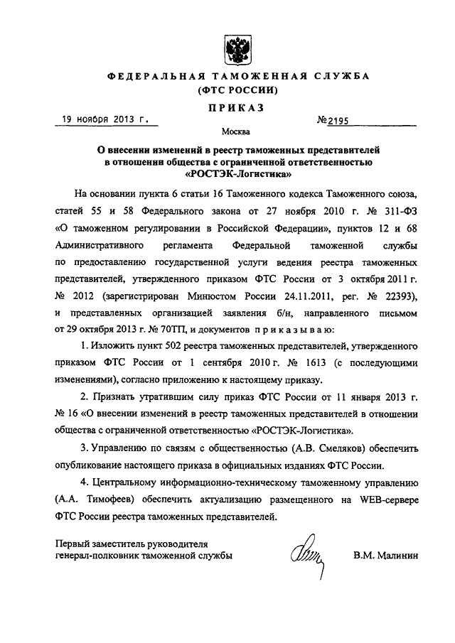 ПРИКАЗ ФТС РФ от 19.11.2013 N 2195