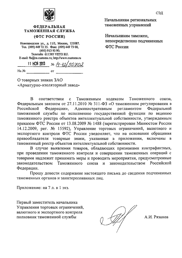 ПИСЬМО ФТС РФ от 11.11.2013 N 14-42/50702