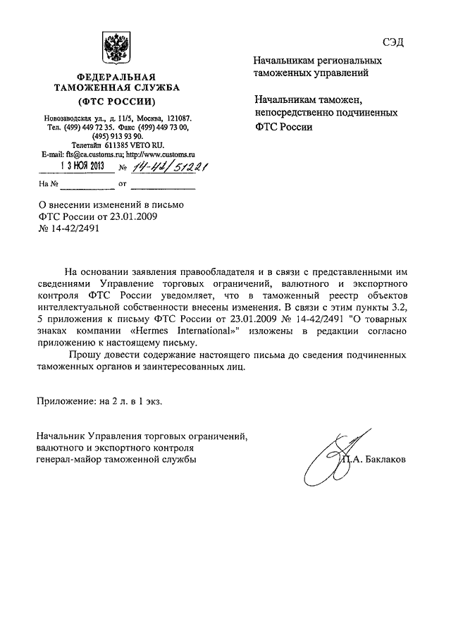 "О ВНЕСЕНИИ ИЗМЕНЕНИЙ В ПИСЬМО ФТС РОССИИ ОТ 23.01.2009 N 14-42/2491"