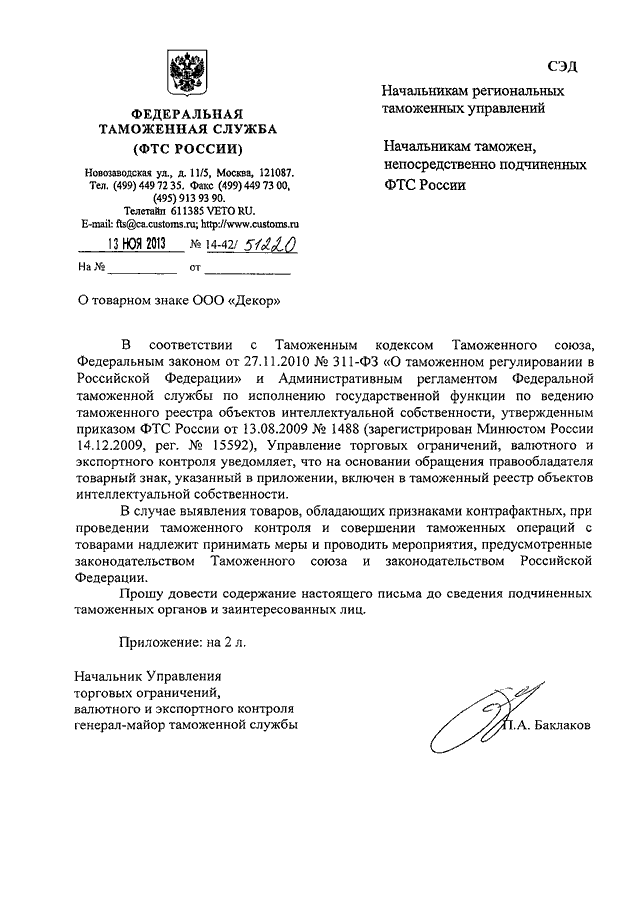ПИСЬМО ФТС РФ от 13.11.2013 N 14-42/51220
