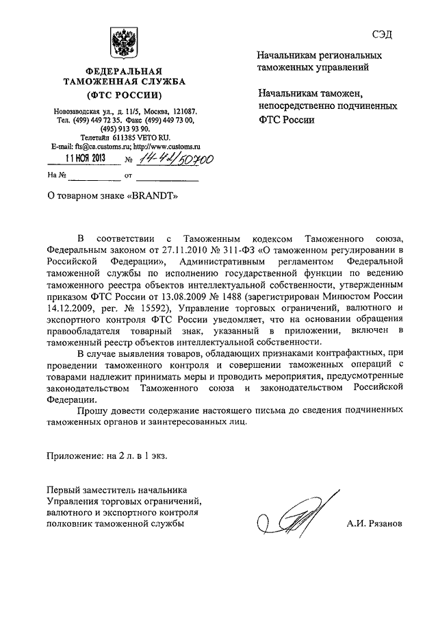 ПИСЬМО ФТС РФ от 11.11.2013 N 14-42/50700