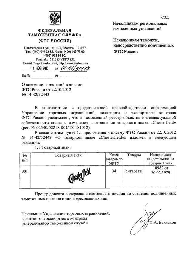 "О ВНЕСЕНИИ ИЗМЕНЕНИЙ В ПИСЬМО ФТС РОССИИ ОТ 22.10.2012 N 14-42/52443"
