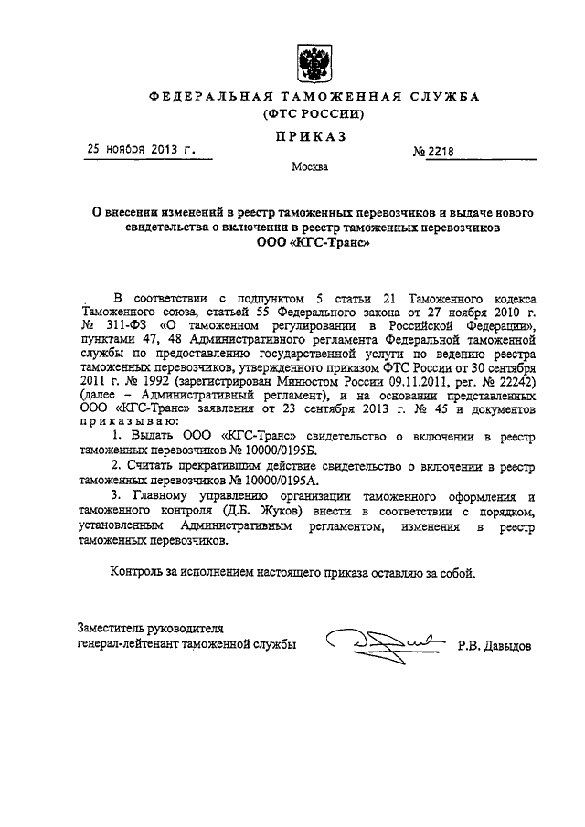 "О ВНЕСЕНИИ ИЗМЕНЕНИЙ В РЕЕСТР ТАМОЖЕННЫХ ПЕРЕВОЗЧИКОВ И ВЫДАЧЕ НОВОГО СВИДЕТЕЛЬСТВА О ВКЛЮЧЕНИИ В РЕЕСТР ТАМОЖЕННЫХ ПЕРЕВОЗЧИКОВ ООО "КГС-ТРАНС"