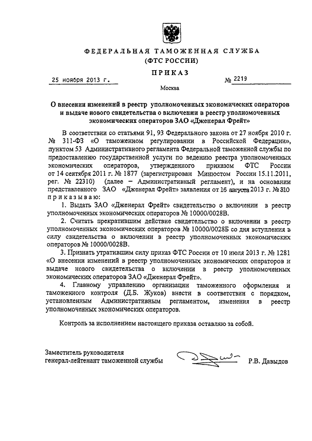 "О ВНЕСЕНИИ ИЗМЕНЕНИЙ В РЕЕСТР УПОЛНОМОЧЕННЫХ ЭКОНОМИЧЕСКИХ ОПЕРАТОРОВ И ВЫДАЧЕ НОВОГО СВИДЕТЕЛЬСТВА О ВКЛЮЧЕНИИ В РЕЕСТР УПОЛНОМОЧЕННЫХ ЭКОНОМИЧЕСКИХ ОПЕРАТОРОВ ЗАО "ДЖЕНЕРАЛ ФРЕЙТ"
