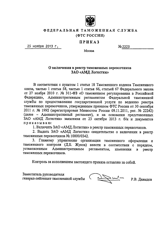 "О ВКЛЮЧЕНИИ В РЕЕСТР ТАМОЖЕННЫХ ПЕРЕВОЗЧИКОВ ЗАО "АМД ЛОГИСТИК"