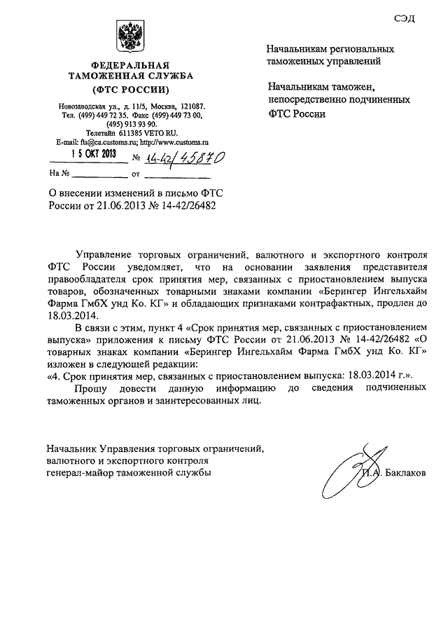 "О ВНЕСЕНИИ ИЗМЕНЕНИЙ В ПИСЬМО ФТС РОССИИ ОТ 21.06.2013 N 14-42/26482"