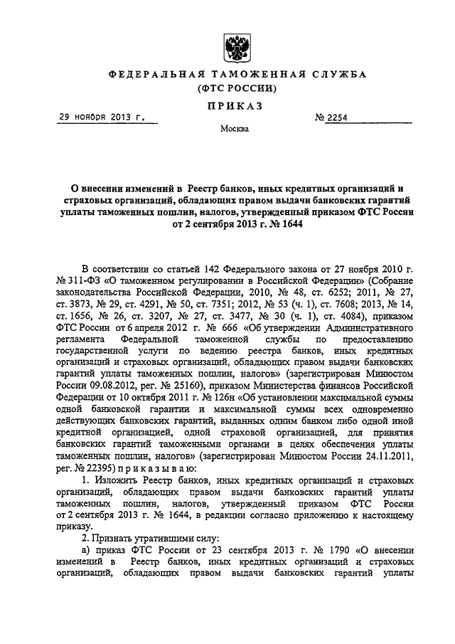 ПРИКАЗ ФТС РФ от 29.11.2013 N 2254