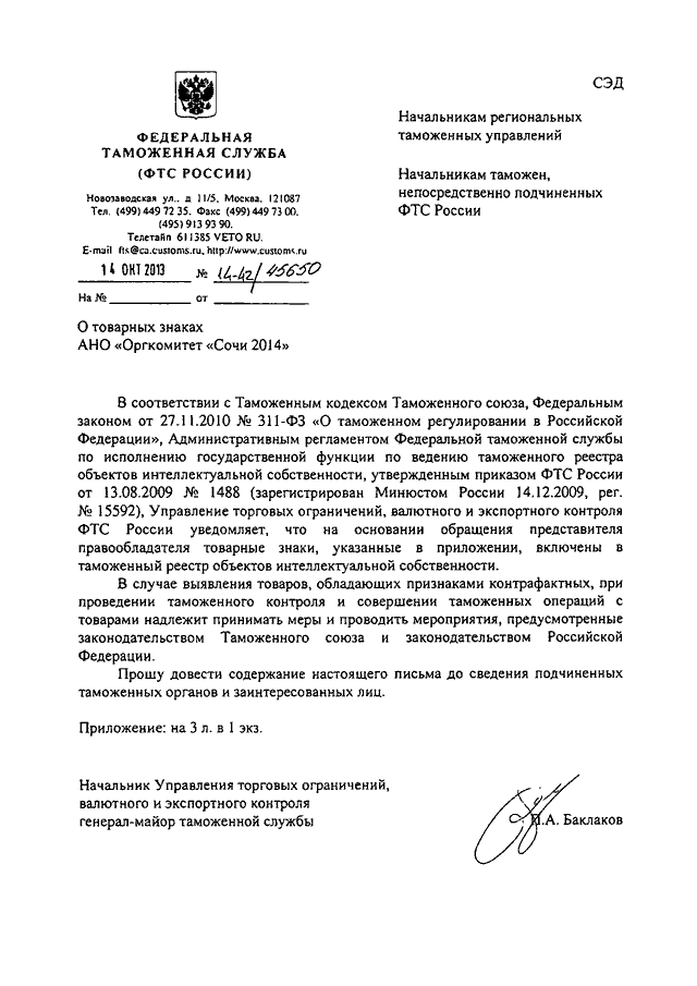 ПИСЬМО ФТС РФ от 14.10.2013 N 14-42/45650