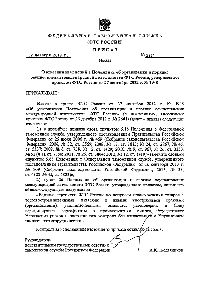 ПРИКАЗ ФТС РФ от 02.12.2013 N 2261