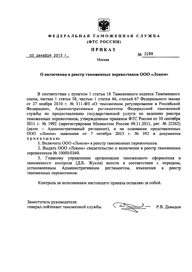 "О ВКЛЮЧЕНИИ В РЕЕСТР ТАМОЖЕННЫХ ПЕРЕВОЗЧИКОВ ООО "ЛОКОМ"