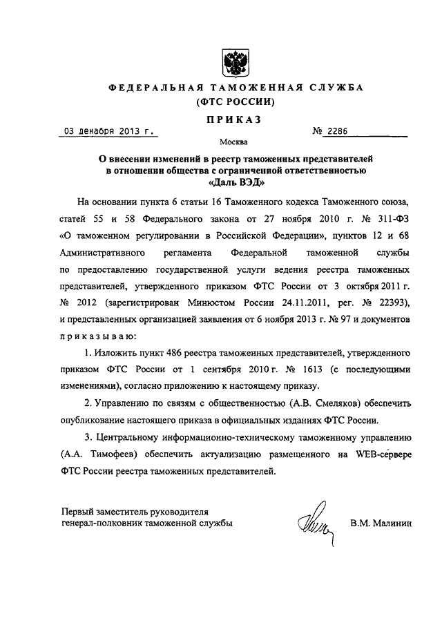 ПРИКАЗ ФТС РФ от 03.12.2013 N 2286