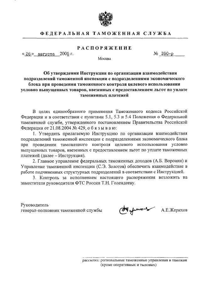 РАСПОРЯЖЕНИЕ ФТС РФ от 26.08.2005 N 390-р "ОБ УТВЕРЖДЕНИИ ИНСТРУКЦИИ ПО ОРГАНИЗАЦИИ ВЗАИМОДЕЙСТВИЯ
