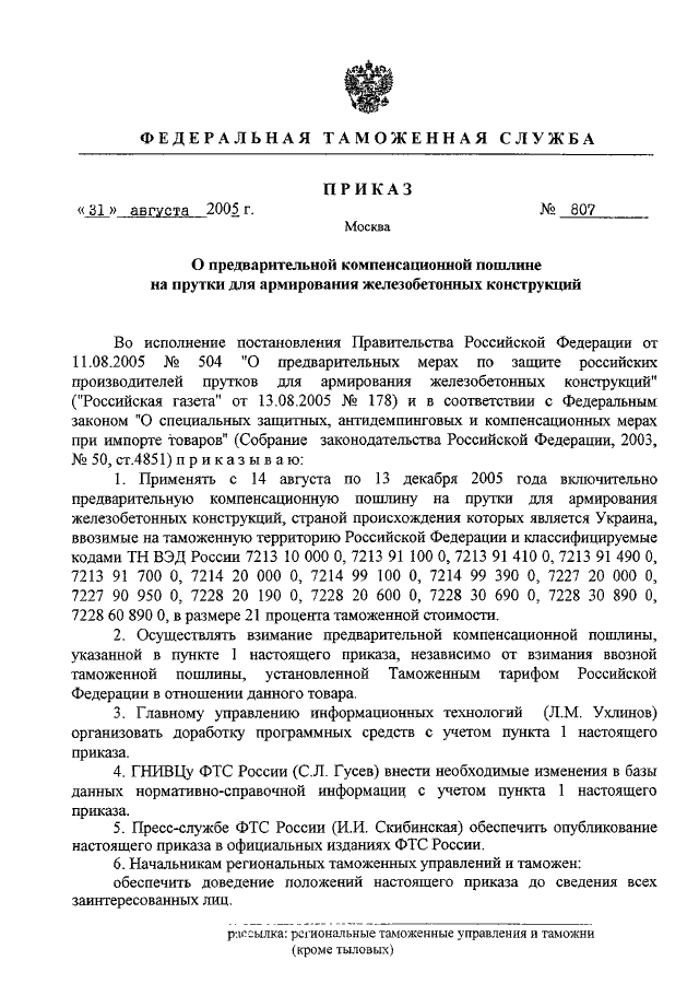 ПРИКАЗ ФТС РФ от 31.08.2005 N 807