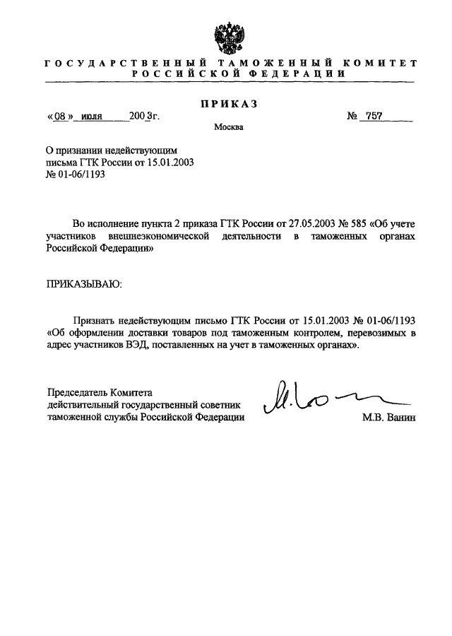 ПРИКАЗ ГТК РФ от 08.07.2003 N 757
