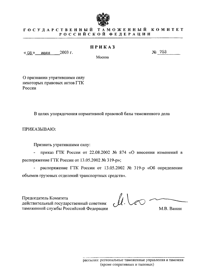 ПРИКАЗ ГТК РФ от 08.07.2003 N 753