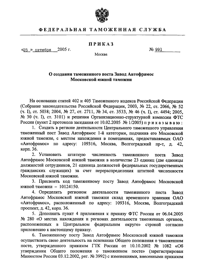 ПРИКАЗ ФТС РФ от 25.10.2005 N 991