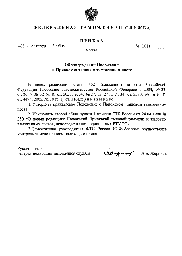 ПРИКАЗ ФТС РФ от 31.10.2005 N 1014