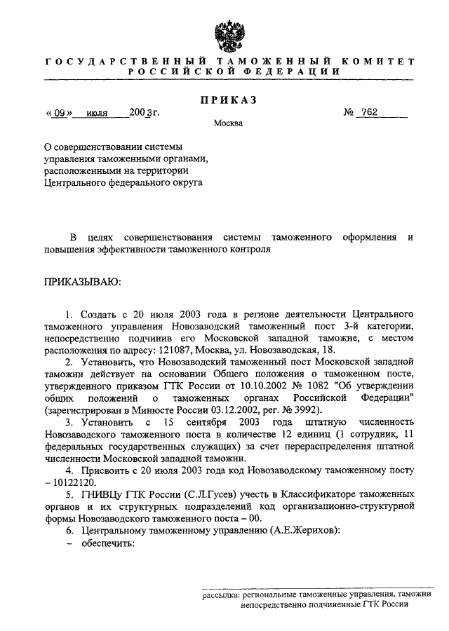 ПРИКАЗ ГТК РФ от 09.07.2003 N 762