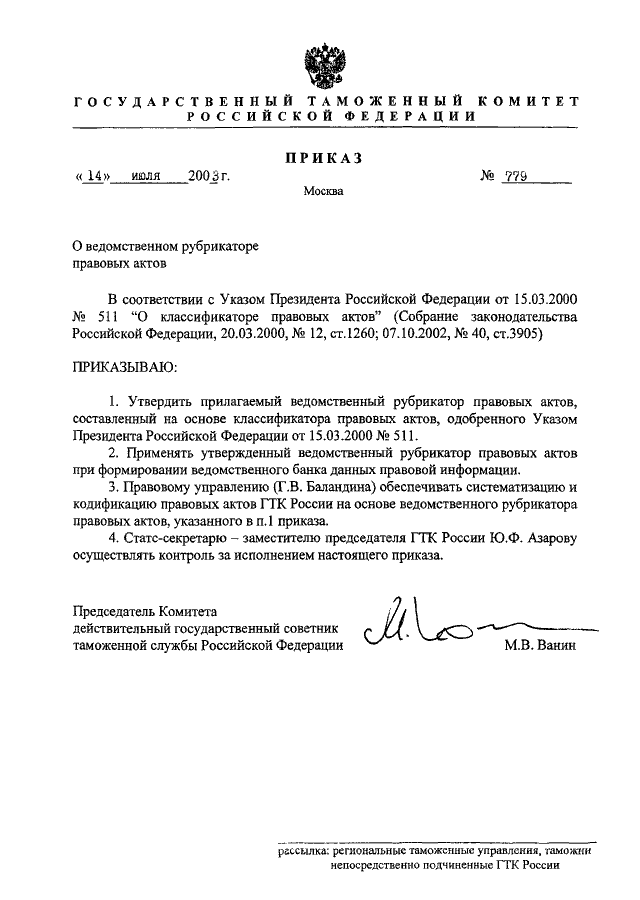 ПРИКАЗ ГТК РФ от 14.07.2003 N 779