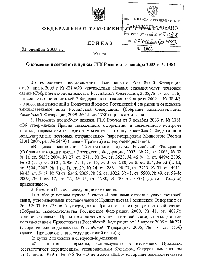 ПРИКАЗ ФТС РФ от 01.10.2009 N 1803