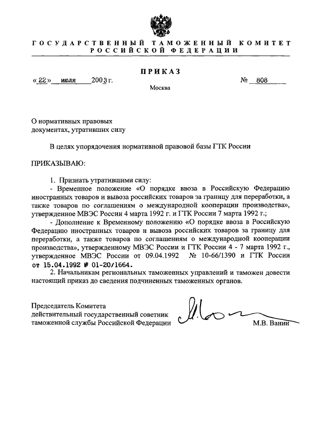 ПРИКАЗ ГТК РФ от 22.07.2003 N 808