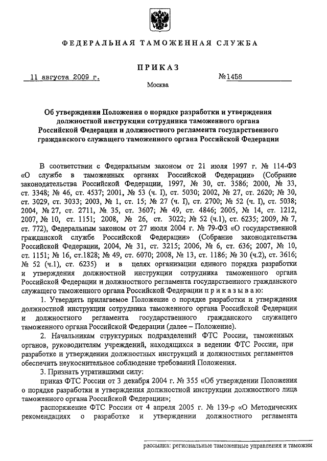 ПРИКАЗ ФТС РФ от 11.08.2009 N 1458 "ОБ УТВЕРЖДЕНИИ ПОЛОЖЕНИЯ О ПОРЯДКЕ РАЗРАБОТКИ И УТВЕРЖДЕНИЯ