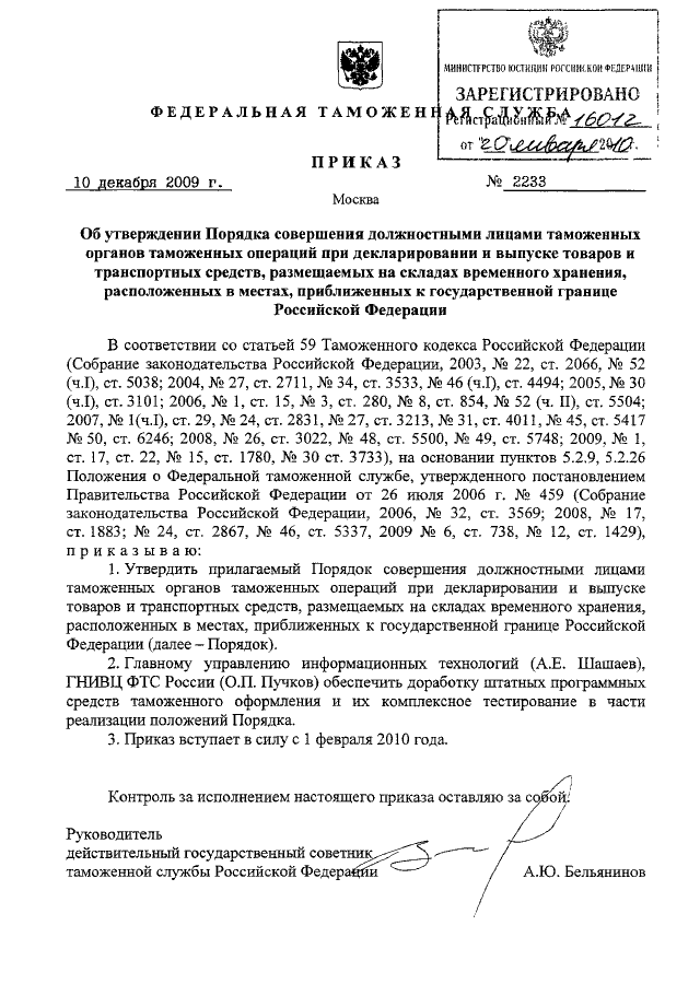 ПРИКАЗ ФТС РФ от 10.12.2009 N 2233 "ОБ УТВЕРЖДЕНИИ ПОРЯДКА СОВЕРШЕНИЯ ДОЛЖНОСТНЫМИ ЛИЦАМИ ТАМОЖЕННЫХ