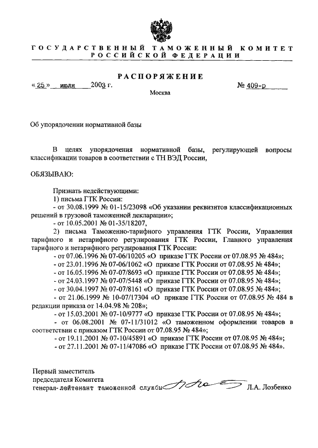 РАСПОРЯЖЕНИЕ ГТК РФ от 25.07.2003 N 409-р