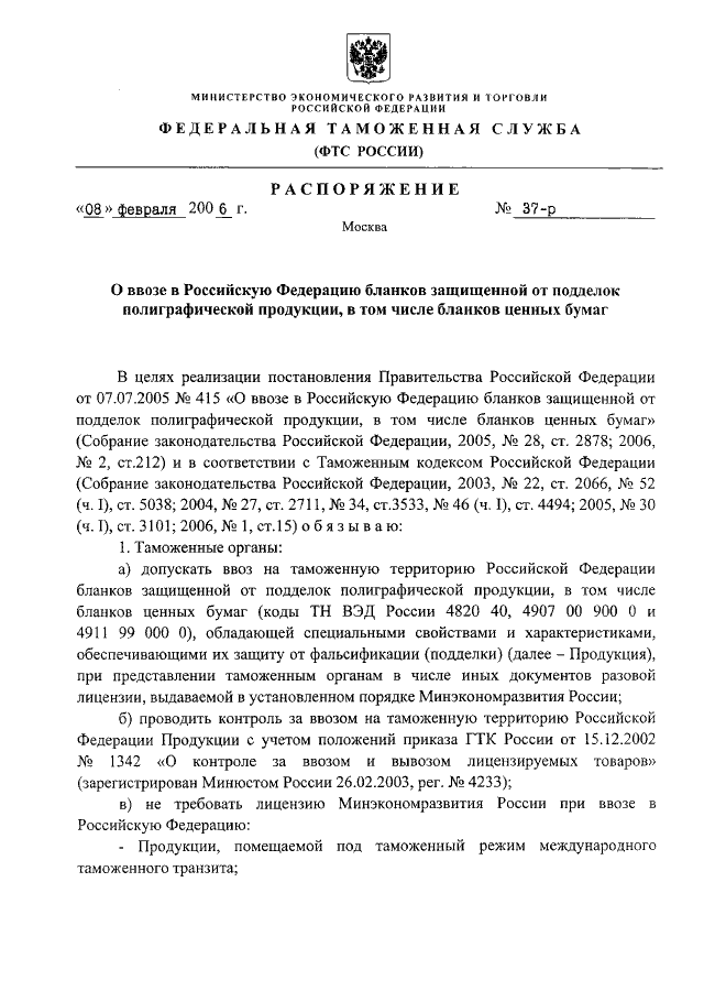 РАСПОРЯЖЕНИЕ ФТС РФ от 08.02.2006 N 37-р