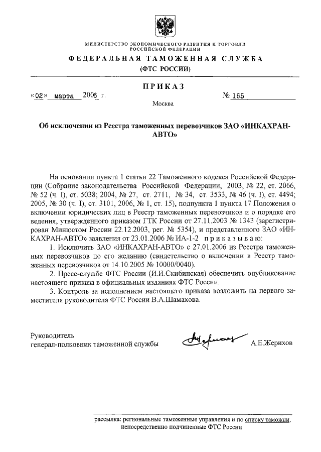 ПРИКАЗ ФТС РФ от 02.03.2006 N 165