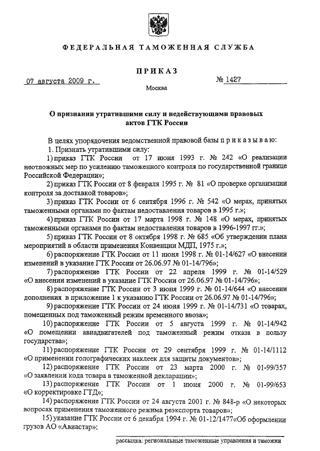 ПРИКАЗ ФТС РФ от 07.08.2009 N 1427