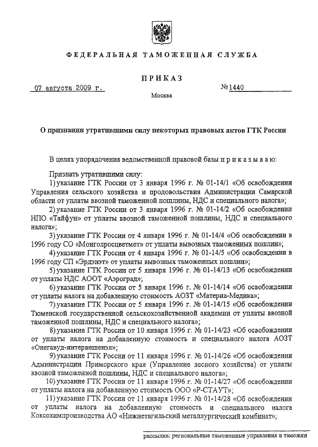 ПРИКАЗ ФТС РФ от 07.08.2009 N 1440