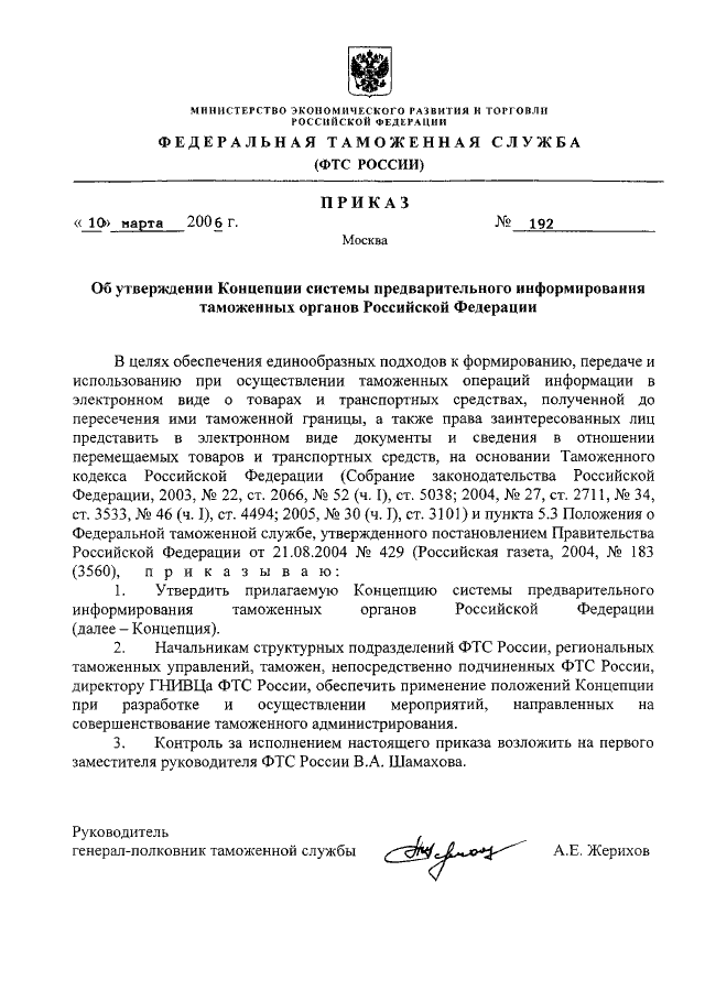 ПРИКАЗ ФТС РФ от 10.03.2006 N 192