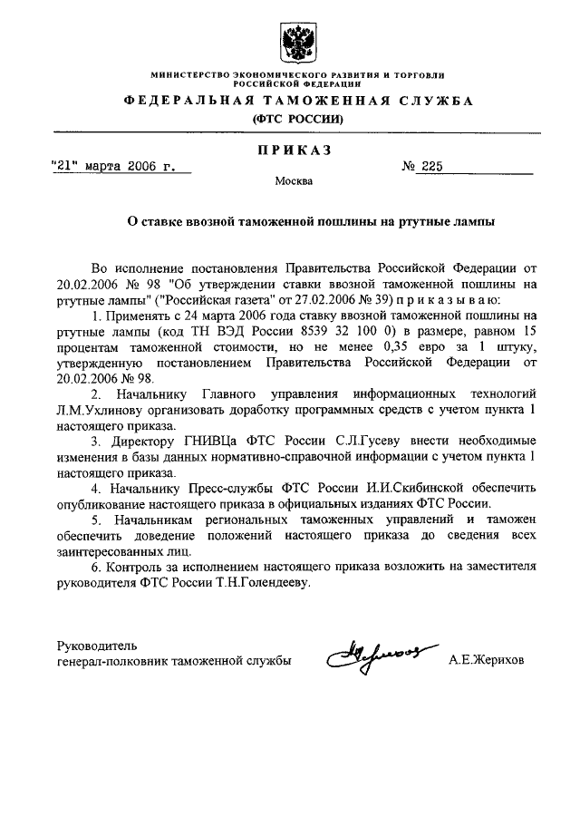 ПРИКАЗ ФТС РФ от 21.03.2006 N 225