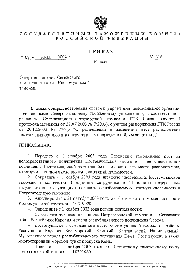 ПРИКАЗ ГТК РФ от 29.07.2003 N 818