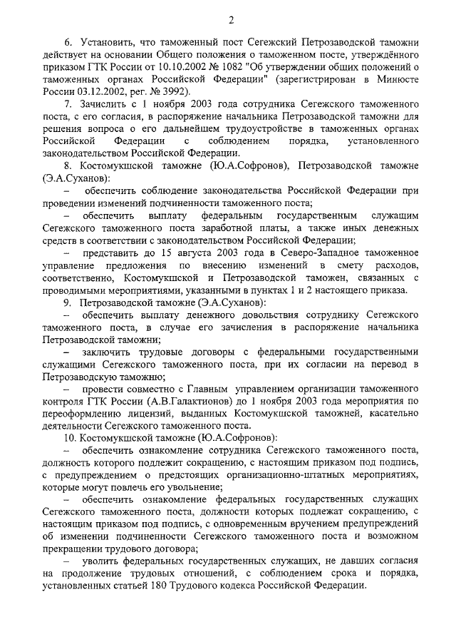 "О ПЕРЕПОДЧИНЕНИИ СЕГЕЖСКОГО ТАМОЖЕННОГО ПОСТА КОСТОМУКШСКОЙ ТАМОЖНИ"