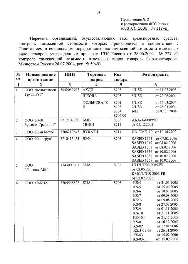 РАСПОРЯЖЕНИЕ ФТС РФ от 03.04.2006 N 117-р
